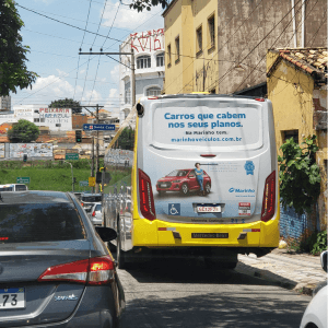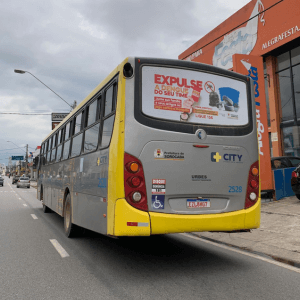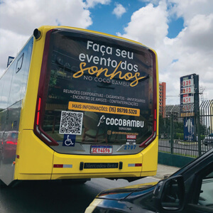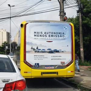 Adesivo aplicado na traseira total do ônibus. A mídia OOH com 3 X mais visualização do que o busdoor. Seu outdoor em movimento.