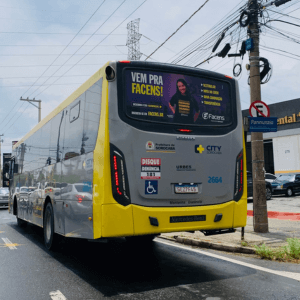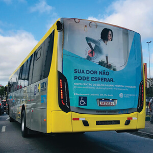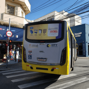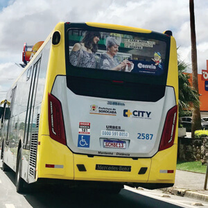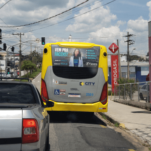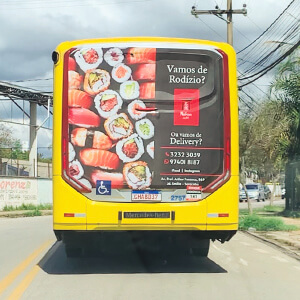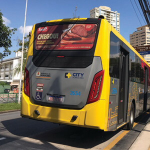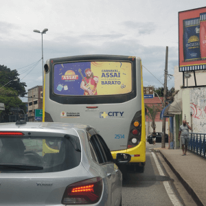 Adesivo aplicado na traseira total do ônibus. A mídia OOH com 3 X mais visualização do que o busdoor. Seu outdoor em movimento.