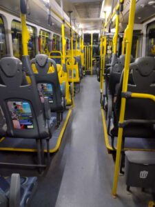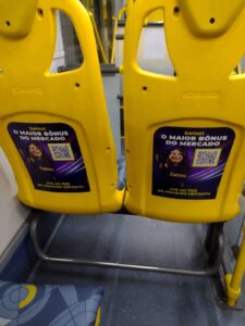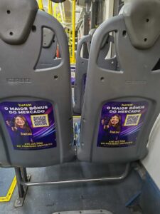 Adesivo aplicado na traseira dos bancos dos ônibus. Uma mídia ideal para se comunicar com o público interno, inclusive potencializando ações e direcionamentos via QR CODE.